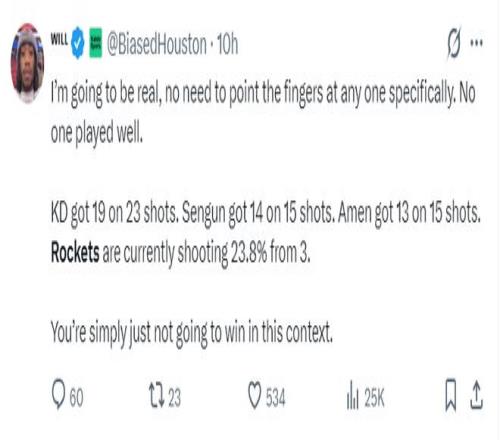 休媒Will写道:说实话没必要将责任归咎于某个球员,因为大家都打得不好,KD23投19分,申京15投14分,阿门15投13分,火箭三分命中率23.8%,这样的情况下火箭不可能赢球。