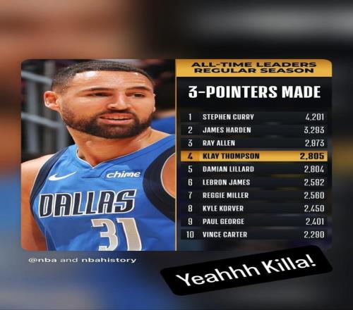 在达拉斯独行侠队主场对阵犹他爵士队的比赛中,克莱-汤普森首节投中一记三分,让自己的职业生涯三分球命中数超越利拉德,升至NBA历史第四位。